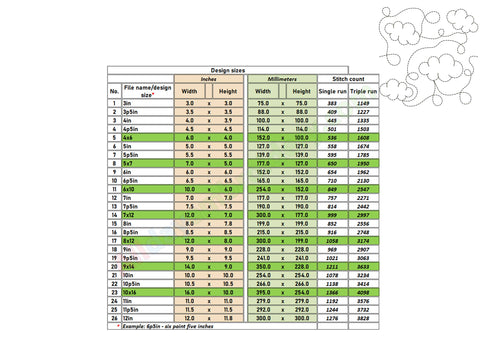 The border design is included in widths from 4 to 12 inches. A full list of dimensions is shown in the product images. Please avoid resizing the files to maintain proper stitch quality.