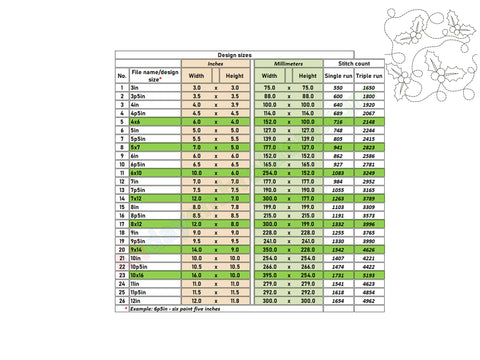 The border design is included in widths from 4 to 12 inches. A full list of dimensions is shown in the product images. Please avoid resizing the files to maintain proper stitch quality.