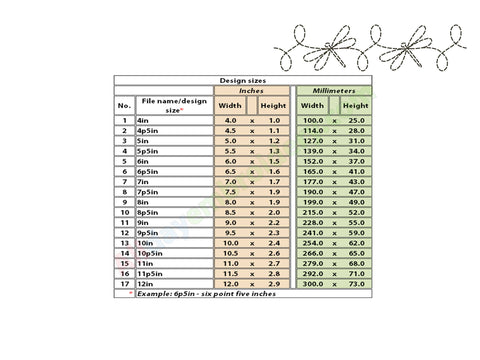 The border design is included in widths from 4 to 12 inches. A full list of dimensions is shown in the product images. Please avoid resizing the files to maintain proper stitch quality.