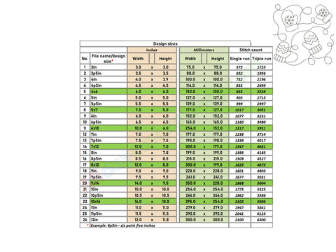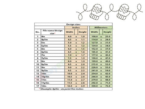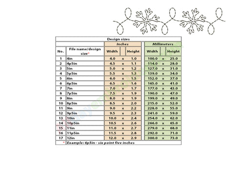 The border designs are included in widths from 4 to 12 inches. A full list of dimensions is shown in the product images. Please avoid resizing the files to maintain proper stitch quality.