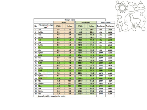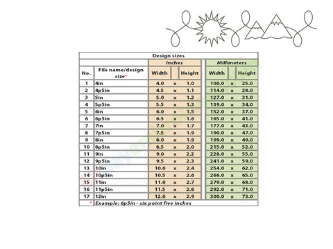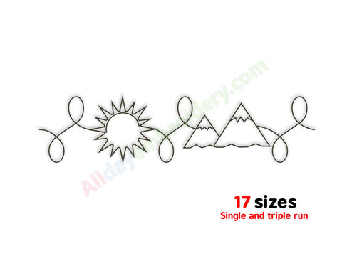 The Sun and mountain peak border design is included in widths from 4 to 12 inches. A full list of dimensions is shown in the product images. Please avoid resizing the files to maintain proper stitch quality.