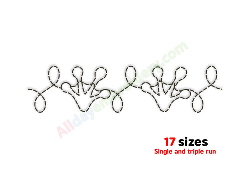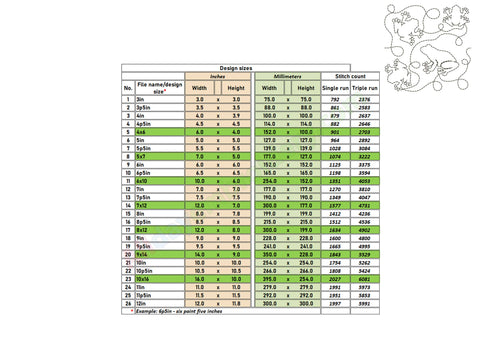 The Frog forelimbs border design is included in widths from 4 to 12 inches. A full list of dimensions is shown in the product images. Please avoid resizing the files to maintain proper stitch quality.