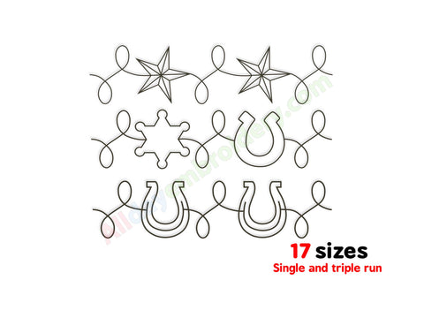 The Star and horseshoe border design is included in widths from 4 to 12 inches. A full list of dimensions is shown in the product images. Please avoid resizing the files to maintain proper stitch quality.